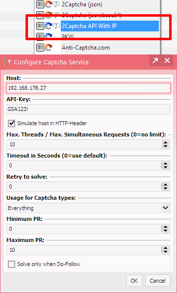 Of course you need to change the IP 192.168.178.27 to the one of your external IP of the server where GSA Captcha Breaker runs on. Also make sure NOT to add any port to that IP…just the plain IP! All calls to that service will now be answered by GSA Captcha Breaker.