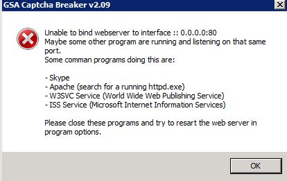It's usually IIS (Microsoft Internet Information Services) that is sitting on port 80 and avoiding a proper use of Captcha Breaker. You have to disable it by clicking: