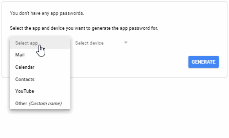 - Select App: Mail, Device: Other, name it: SMTP (example), Click GENERATE and yo get the app password