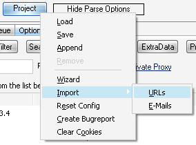 An other option to get emails into the program is the Project → Import button. You can choose almost any document (e.g. *.html *.txt or even binary formats) and the program will try to search for emails in it and add it to the list.