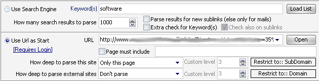 Use this option if you want find E-Mails from people who have some specific relation to the entered keyword(s). You can also enter the number of results to parse that the search engine delivers (1000 is the maximum as most search engines will not deliver more than that). The option „Parse results for new sublinks“ will parse the found website also for sublinks and may then also find a „Contact“ website for that homepage.