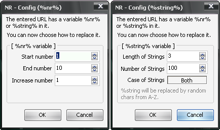 %nr% stands for “number” and will insert a number counting from start number to end number that you define, where %string% will insert a random generated string. The result are generated URLs that are all getting parsed by the program. You don't need %string% in most cases. Just %nr% is interesting for you as it can be used to speed things up when you found an URL that holds all the data you need and uses a parameter that is a number. Usually this is a database ID.