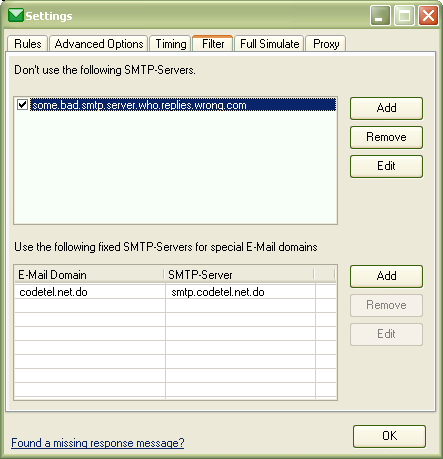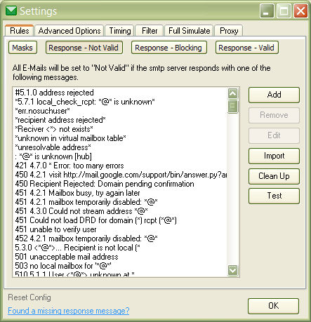 SMTP-Servers will reply with a message. Some tell the program that the E-Mail is valid, others say it's not. You can define that here in case you have some replies that are not defined already. Please also contact us and tell us the missing once.