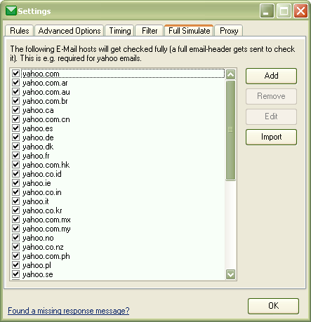 A Full Simulate is done when the E-Mail belongs to the listed providers. Normally the program stops the delivery of an E-Mail before it gets actually sent since we only want to check the E-Mail itself and not want to send any message. Some providers will only deliver a correct status when the program goes further and sends some more commands. This is done in the case of yahoo E-Mails. But don't worry even in this case no E-Mail is getting sent out as the program stops the delivery before the final step.