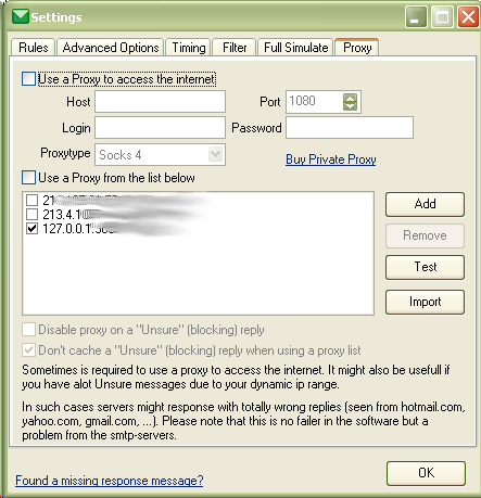 You can think of a proxy as a middle man that actually delivers the messages you want to send. The proxy also sends back replies he gets from the E-Mail server. In case you get a lot of “Unsure” (yellow color) replies, please don't blame the program but your dynamic IP. You should consider buying a proxy to get better results. One known service that other customers use is Hide-My-IP.com