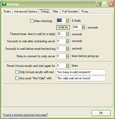 An SMTP-Server can also reply with a message that is not telling us that an E-Mail is valid or not but tells the program that that server will probably never allow us to verify E-Mails. If thats the case and one of the entered masks is matching, it will no longer be used for verification and all emails belonging to that server will be tagged as Unsure. Again, if you think we are missing some masks here, add them and contact us please to update the software.