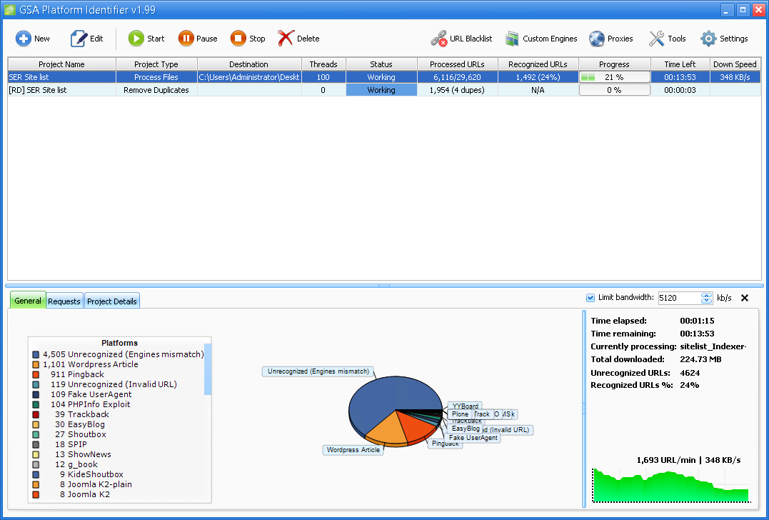 With GSA Platform Identifier, you can automatically identify and sort imported URLs based on their platform (E.g., Drupal, BlogEngine, Expression Engine, and many more). There are many different URL filtering options available. GSA Platform Identifier can automatically filter URLs by Outbound link count, Keywords present on-page or URL, Page-Authority, Domain-Authority, Citation Flow, Trust Flow, Emulated Page Rank, and more. GSA Platform Identifier can also monitor files/folders and automatically import new URLs into projects or deduplicate files in a folder.