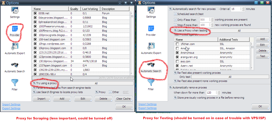The product scans for proxies (IP with a port behind) on all kinds of different websites. Scraping for proxies is usually not a problem, but later the testing counld turn to one. Some really stupid VPS or even ISP providers think that this testing is some kind of a port / net scan. This is of course not the case and the program tries to randomize this testing as best as possible. However it can happen and if you get into such situation, you might need to use a proxy for testing and maybe also for scraping. That can be turned on with two options as seen below: