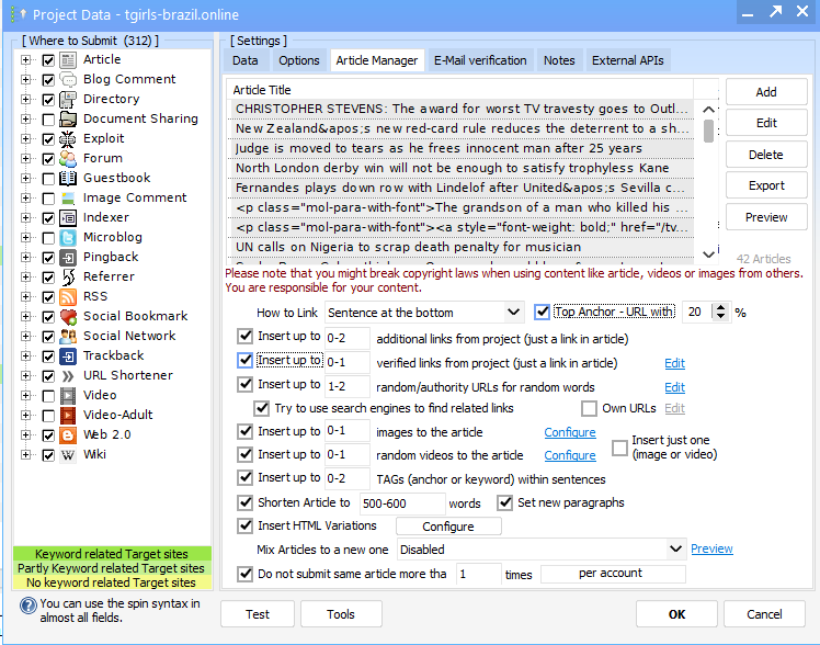 A right click on the Box will open other options for you like adding spin syntax to the selected articles or counting the usage of the articles on present verified URLs.
