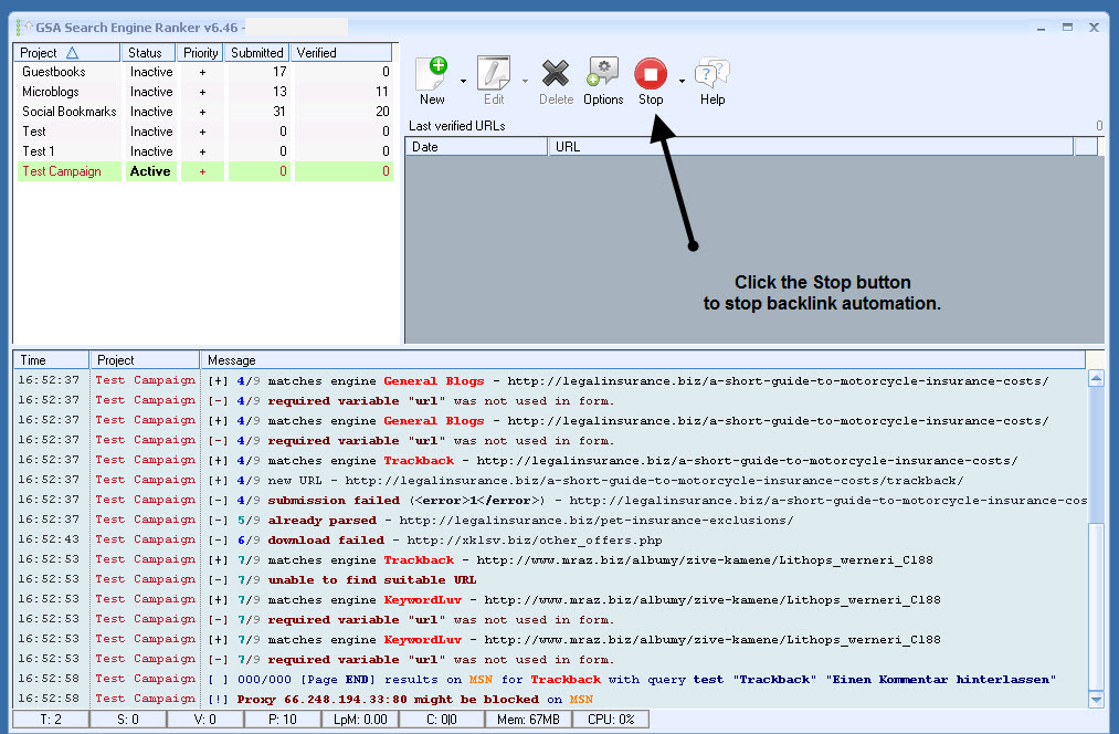 To stop backlink automation, click on the Stop button.