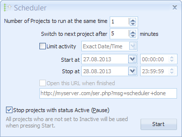 You can on the next dialog configure it to start either at a set time or only run projects for a set number of minutes before switching to another one.