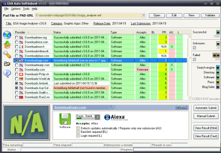The GSA Auto SoftSubmit is a program designed to submit your software to hundreds of web sites. It will save you a lot of time and money since its fully automated. Promoting your software has never been easier. Load a PAD file and let the program do the rest. The program gets updated several times a month to make sure all included providers (over 3.900 and growing) still work. There are a lot of web sites with shareware and freeware. Is your application listed on those? This program will take care of it and submits your software to all of them. But why is it so important to have your software listed there? Not only that more customers will find and buy your software, but also your ranking in the search engines will dramatically rise since many of the shareware sites have a back link to your web site.