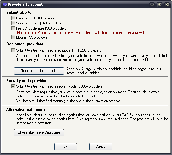 Some sites want you to place a link to there sites on your site before you start the submission. Simply leave the box unchecked if you don't want these providers. However if you want them, you have to place a link to them. You can do that with the Reciprocal Link Manager. But make sure all links are present before the submission.