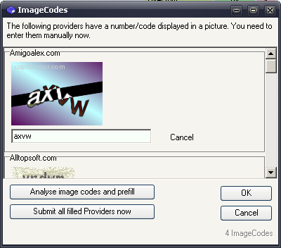 If you have chosen to submit to “image code providers”, you will probably see a screen as above. Just fill the codes and press ENTER or the OK button. You will only see the codes where the internal analysis of the images failed and where also the captcha service that you might have used failed. At the bottom you see how many captchas are waiting to get filled. The button Analyse image codes and prefill will use the internal analysis function to fill the codes but with a less accurate algorithm.