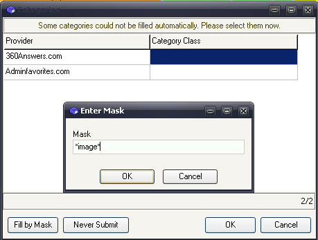 At the end of the submission, you will be asked to fill categories for providers where no matching category was found. You can do that while clicking into the Category Class column, or by simply using “Fill by Mask”. When using the “Fill by Mask” function it will search all categories if they match a certain entered mask. In this case we search for all categories with “Image” in it. A Box will get displayed to you where you can choose the categories that might match your expectations and assign them to your alternative categories.