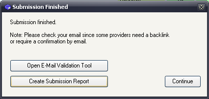 There are various ways to submit to the sites. The most common one and the one you will probably use is the fully automated submission. That's possible with Main Menu → Submit → All checked Providers. A dialog as the one above will appear where you can again fine tune the submission process.