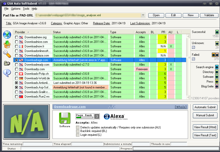 In the middle you see the sites you can submit to (provider name, submission status, site type, what they accept as submission, if they require a back link (BL), auto update on pad change (AU), login required (L)). Next to the site listing you will see the statistics of successful, failed and unknown submissions together with the color and numbers. At the left you see the toolbar where you can do different things like start the submission, go to settings menu, check for program updates and fine tune the site selection. The bottom holds information about the highlighted provider in the listing (screenshot, pagerank, …).