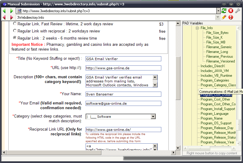 A manual submission is almost the same as when you load the site in your browser and fill the fields. Well almost, as our program will fill the fields for you whenever it is possible. Usually you only have to fill the image code or category before pressing the “Submit” button on the page. At the right you will see the possible variables you can set (use right mouse button to copy/paste).