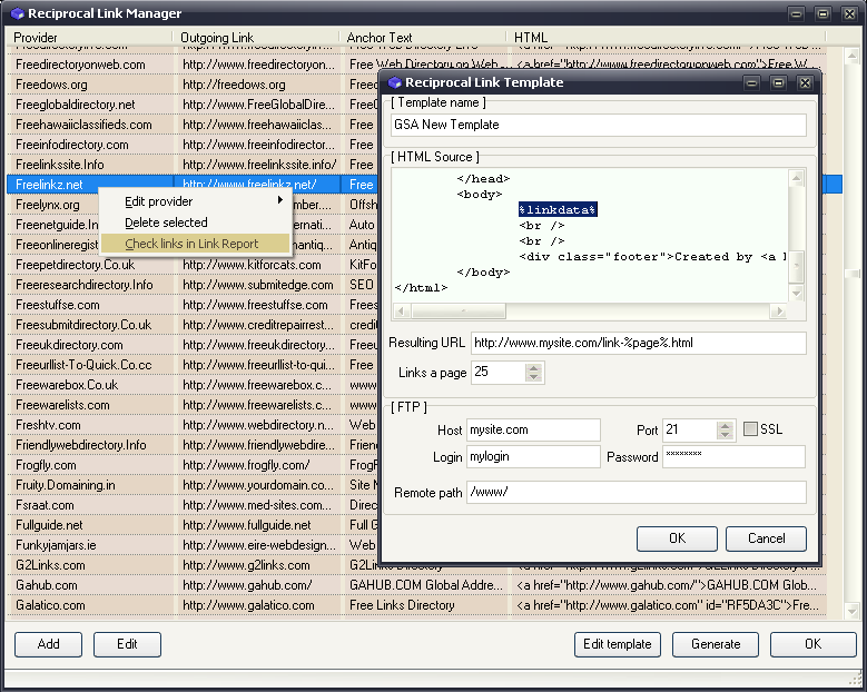 By the popup menu in the list, you can do other things like checking for a link to your site on that provider. The final step would be to Generate the actual html pages and upload them to your server.
