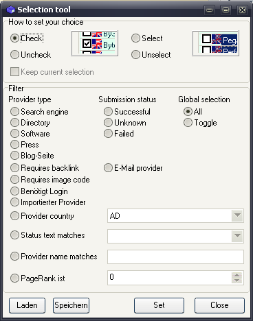 Usually you will not need this as the program tracks where you have successfully submitted and will uncheck the sites for you when you load a project. If you wish to submit to certain sites, use the Selection Tool. Click Main Menu → Tools or Tool bar (left of Provider List).