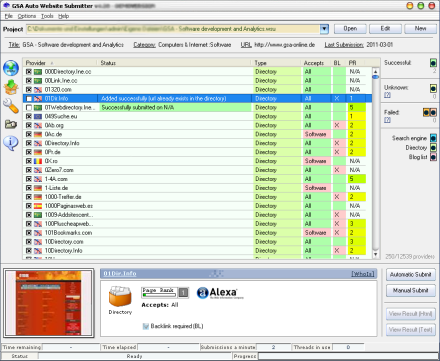 The GSA Auto Website Submitter is a program designed to submit your website to thousands of search engines and directories. It will save you a lot of time and money since its fully automated. Promoting your web page has never been easier. You just enter some information about your web site and the program does the rest.